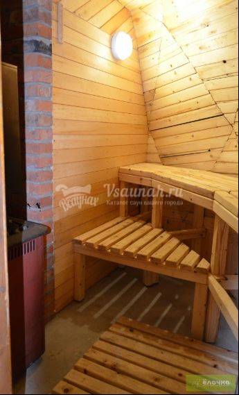Наши бани выполнены в виде куполов. В тоже время по начинке они являются 'русскими'. Печки с двойными каменками топятся березовыми дровами изнутри. Наши гости сами регулируют температуру в парилке. Кому-то нравится классический температурно-влажностный режим, кому-то режим 'сталеваров',а кому-то просто погреться. Каждая баня расчитана на комфортное расмещение до 6 человек и состоит из трех зон: парная, душевая с обливным ведром и комната отдыха. На улице располагается купель под навесом-кедровая бочка высотой 1.5 м и диаметром 1.2 м с ледяной проточной водой. После посещения купели наши гости испытывают невероятный прилив бодрости, легкости, хорошего настроения.